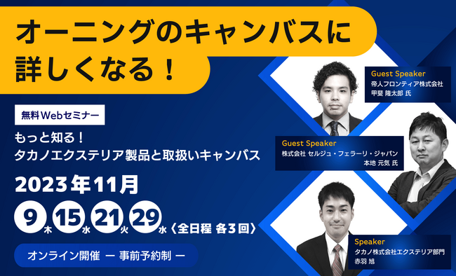 タカノ株式会社(本社:長野県上伊那郡宮田村、代表取締役社長:鷹野 準)は、オーニング(日よけ・雨よけ)のキャンバス地に詳しくなれるWebセミナー「もっと知る!タカノエクステリア製品と取扱いキャンバス」を、2023年11月9日(木)~11月29日(水)の期間、オンライン形式にて開催します。