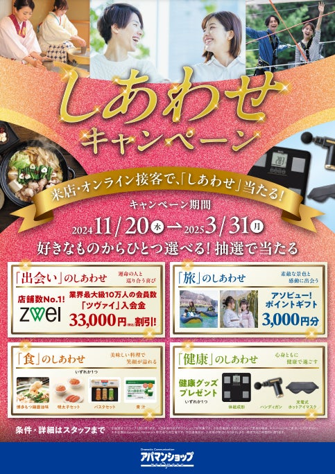 賃貸住宅仲介業店舗数No.1*1のApaman Network株式会社(東京都千代田区・APAMAN株式会社の連結子会社 代表取締役社長 山崎戒)は、2024年11月20日から2025年3月31日までの期間限定で「しあわせキャンペーン」を実施します。このキャンペーンでは、抽選で様々なしあわせに関する賞品が当たります。ZWEIの入会金3万円の割引や健康グッズ、美味しい料理、旅行体験など、出会い、健康、食、旅に関連する素敵なギフトをご用意しております。