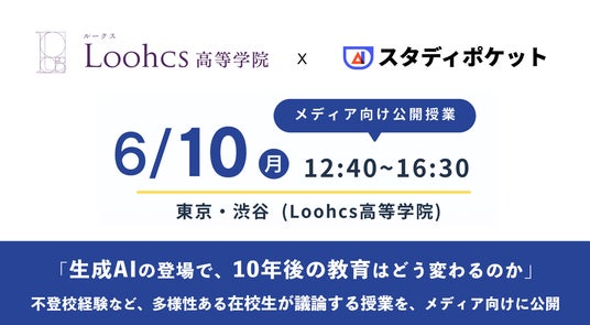 教育機関・学校に特化した、生成AIでの学習支援・校務支援サービス「スタディポケット」を提供するスタディポケット株式会社(東京都渋谷区、代表取締役 鶴田 浩之)は、「Loohcs高等学院」(東京都渋谷区、代表者 嶺井 祐輝)において、生成AIサービスの全校導入を行い、2024年6月10日(月)に、マスコミ・メディア向け公開授業を共同で実施いたしますので、お知らせいたします。