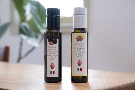 流通している「トリュフオイル」の中には香料のみを使用しトリュフフレーバーのオイルとして販売されているものもありますが、本商品にはイタリア産のトリュフが使用されています。高級なトリュフを贅沢に使ってオイル漬けし、採取されたナチュラルアロマも特徴です。