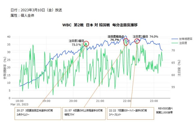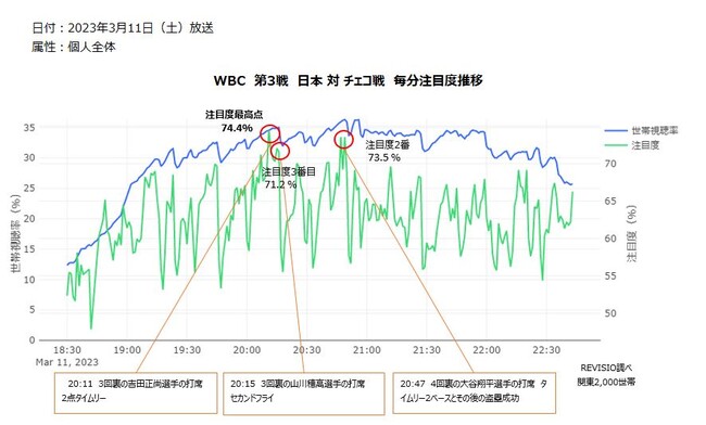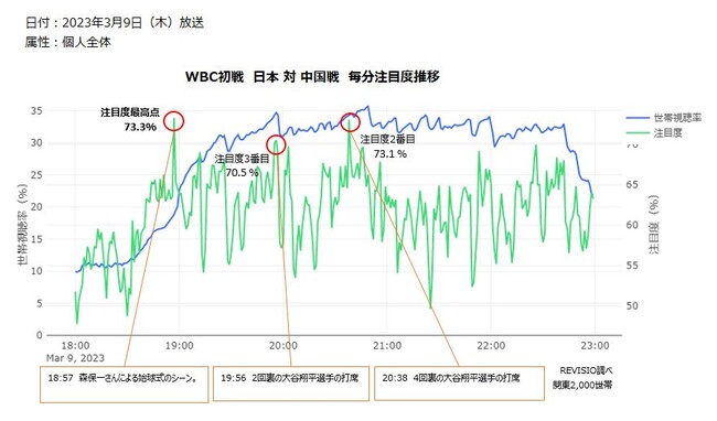 ご家庭に人体認識技術を搭載した機器を設置し、テレビスクリーンへの「注視」を測るREVISIO株式会社(旧TVISION INSIGHTS、本社:東京都千代田区、代表取締役社長 郡谷康士、以下REVISIO)は、3月9日,10日にTBS系列で、11日,12日にテレビ朝日系列で放送されたWBCの1次リーグ日本戦の4試合について、どのシーンが一番視られていたのか毎分の注目度データを使って、分析致しました。(注目度が高いとは、テレビの前の視聴者がくぎづけになったことを表します)