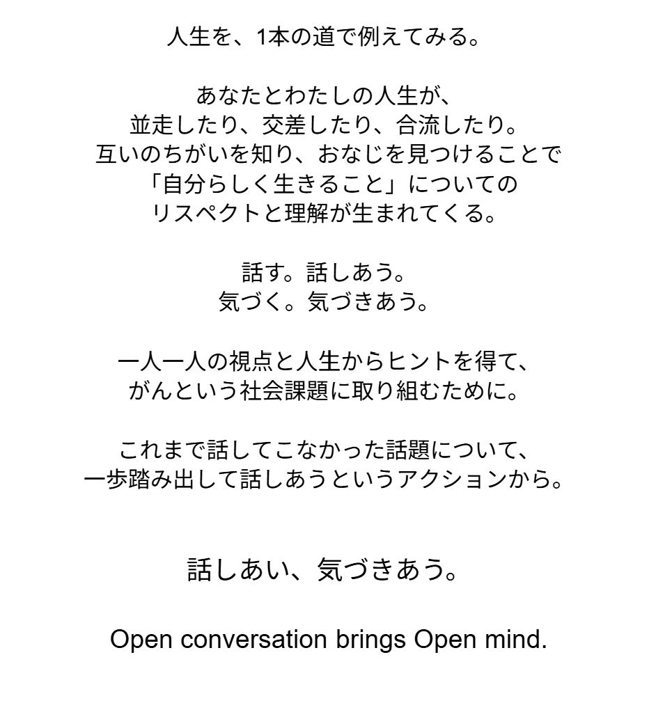 「話しあい、気づきあう。Open conversation brings Open mind.」