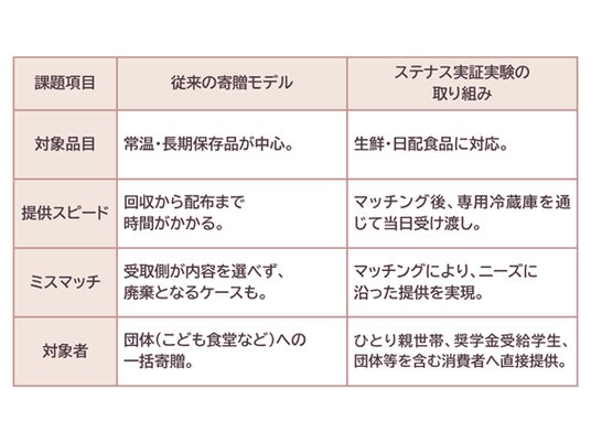 一般社団法人サスティナブルフードチェーン協議会(所在地:東京都千代田区、代表理事:入江満美、以下SFA)は、こどもの機会格差の解消を目指すネッスー株式会社、株式会社ライフコーポレーション、株式会社東急ストアと連携し、食品ロスとこどもの貧困の2つの社会課題の解決を目指した食品マッチングプラットフォーム「ステナス」の実証実験が終了いたしました。