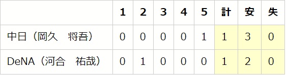 以降はエースの投げ合いらしく、試合は動かず。中日・岡久はDeNA投手陣の前に走者すら出せない展開が続いていただが、最後に底力を示した。5回表、三者連続で代打を送る執念の采配をみせると、2死から高橋周が直球を見事に捉え起死回生の同点ホームラン。5回裏にはDeNAも代走に投手・山崎康を送り込むなどサヨナラを目指して死力を尽くしたが得点はならず、1-1の引き分けでゲームセットとなった。