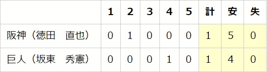 1回裏、巨人の3番・坂本のセンターオーバーの大飛球を近本がダイビングキャッチ。阪神・徳田が守備のビックプレーからリズムを作る。続く2回表、梅野の2ベースと江越のヒットからチャンスを作った阪神は、代打・糸原のセンターへの犠牲フライで1点を先制した。