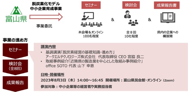アークエルテクノロジーズ株式会社(本社:福岡県福岡市、代表取締役社長:宮脇良二、以下「AAKEL」)は、富山県より脱炭素化モデル中小企業育成事業実施業務を受託しました。8月3日(木)14:00~16:45に富山県会場(会場:富山県民会館)及びオンラインの両会場においてセミナーを開催します。セミナーでは脱炭素経営の進め方に関する基調講演、近隣県の製造業を中心とした取組み事例の紹介を行います。