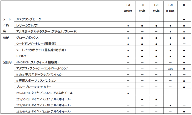 グレード展開は、Travel AssistやPark Assistなどの最新の運転支援システムが標準装備とした『TSI Active』をエントリーグレードに設定し、LEDマトリックスヘッドライト“IQ.LIGHT”やパワーテールゲート(挟み込み防止機能付、“Easy Open & Easy Close”機能付)を標準装備した『TSI Style / TDI Style』、R-Line専用エクステリアやシートを身に纏い、18インチアルミホイールを装着した『TDI R-Line』、そしてT-Rocで唯一フルタイム4輪駆動“4MOTION”を採用し、アダプティブシャシーコントロール“DCC”を標準装備、内外装でスポーティーな専用の内外装に加え、専用のスポーツサスペンションにブルーでペイントされたブレーキキャリパーを装着したハイパフォーマンスモデル『R』の合計5グレード展開です。