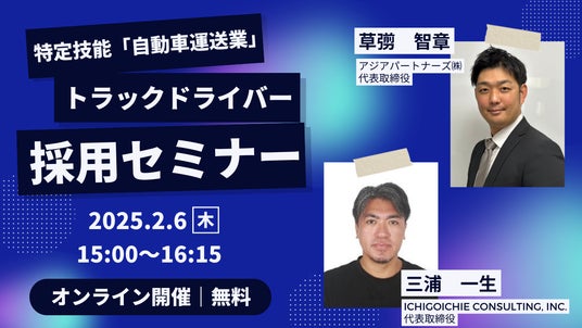 ICHIGOICHIE CONSULTING, INC.(本社:フィリピン、代表取締役:三浦一生)とアジアパートナーズ株式会社(本社:千葉県、代表取締役:草彅智章)は、2025年2月6日(木)特定技能の外国人トラックドライバーの採用に特化した無料オンラインセミナーを開催します。