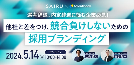 「働く人」から企業の魅力を伝える採用ブランディングサービス「talentbook」を運営する株式会社PR Table(住所:東京都千代田区、共同代表取締役:大堀航/大堀海 以下、当社)は、2024年5月14日(火)に株式会社才流 土山 勇人氏をお招きし「採用ブランディング」をテーマとしたオンラインイベントを開催いたします。