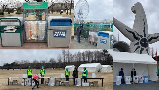 春の空気に包まれた万博記念公園には多くの観客が集まり、走り抜ける選手たちに声援が送られました。その会場のゴミステーションで使用されたごみ袋は、廃プラスチックを国内循環させるプロジェクトから生まれた99%再生材ごみ袋『FUROSHIKI』です。