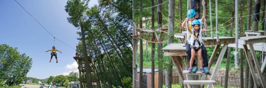頂上8mのアスレチックや、森の中のジップラインなど。空中アスレチックでドキドキ体験!