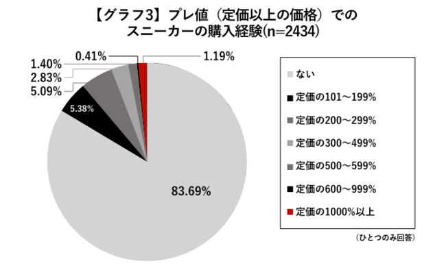 約1.2%が「定価の10倍以上」で購入している。スニーカー投資の潜在市場の一要素を示す調査も行いました。全回答者(2,434人)のうち、「スニーカーをプレ値(定価以上の価格)で買ったことがありますか。」との問いに「101%以上」と答えた方は全体の16.3%となりました。これは実際にスニーカー投資を行っている方(9.24%)を上回る数値です。もっとも大きなボリュームゾーンは「定価の101~199%」5.38%(131人)、次いで「定価の200~299%」5.09%(124人)との結果でした。「定価の1000%以上」の方も1.19% (29人)存在することが明らかになりました。【グラフ3】