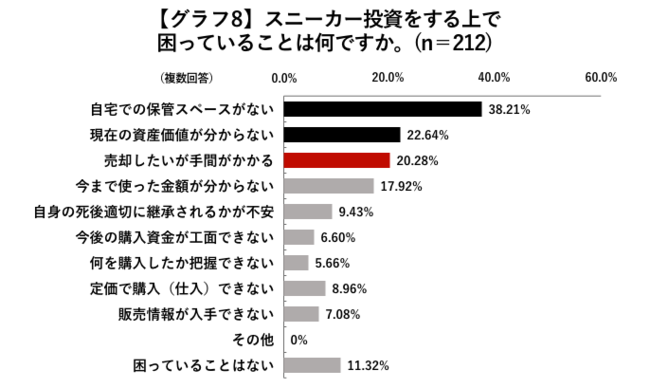 実際に運用してみなければわからない課題や困りごとの1位は「自宅での保管スペースがない」 (38.21%)という結果でした。やはり自宅に置くスペースが限られてしまう状況のようです。また、スニーカーには湿度や経年劣化などで変質する素材が使われており、保存状態で価値が変動しますが、適切な保管方法が確立していないことも一因と考えられます。「現在の資産価値が分からない 」(22.64%)、「売却したいが手間がかかる」(20.28%)と回答した方も一定数おり、売買プラットフォームの整備・普及が待たれていることも伺えます。逆に、他の投資商品で課題に挙げられることの多い「今後の購入資金が工面できない」(6.60%)は少数でした。【グラフ8】