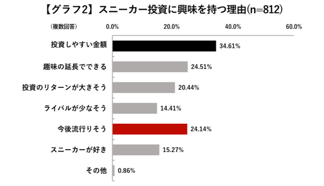 次に、「スニーカー投資に興味がある」と答えた方812名を対象に、その理由を尋ねました。「スニーカー投資のどんなところに興味がありますか。」との問いに対する答えは、「投資しやすい金額」(34.61%)が1位、「趣味の延長でできる」(24.51%)が2位となり、「エントリーのしやすさ」が大きな魅力と言えそうです。「今後流行りそう」(24.14%)、「ライバルが少なそう」(14.41%)と「トレンド性」または「将来性」に注目する投資経験者が多いことも特長的です。【グラフ2】