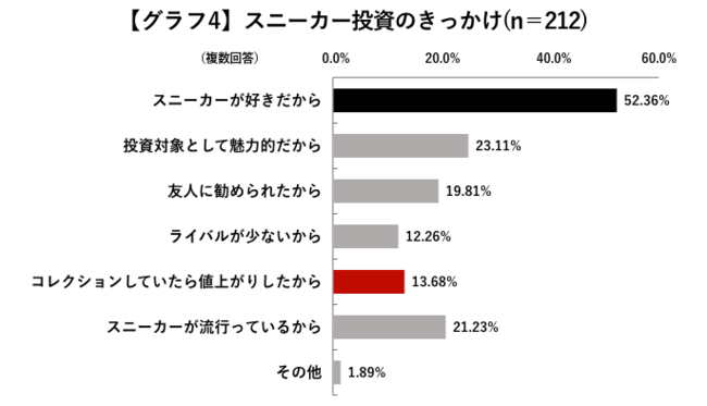 スニーカー投資をはじめたきっかけは「スニーカーが好きだから」が約5割と圧倒的。