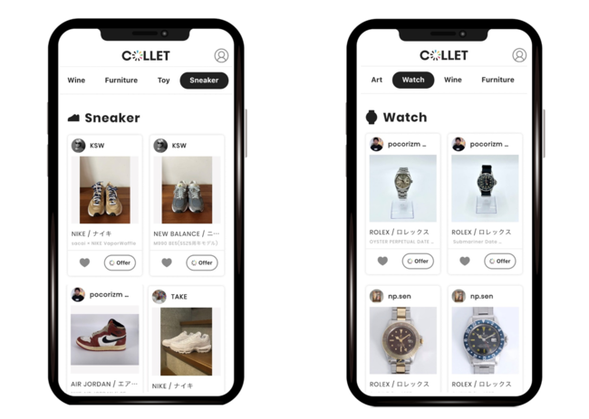 このような実態を踏まえ、コレクション資産管理サービス「COLLET」では、代表的な個人資産である「預貯金、不動産、株式」などとは異なる領域での資産運用の活性化に寄与すべく、当初の“Art”、“Toy”、“Furniture”、“Wine”に加え、“Sneaker”、“Watch”の2カテゴリを新たに追加しました。