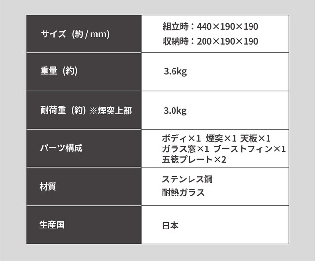 ドラフト効果(煙突効果)を利用して、少量の燃料で強い火力を生み出すことができるのが特徴です。