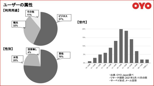 OYO Japanは2019年に日本でサービスを開始した宿泊事業「OYO Hotel(オヨ ホテル)」の運営会社として、「好きなときに、好きな場所へ」というコンセプトのもと、全国各地に200以上のバラエティ豊富なホテルや旅館を「OYO Hotel」と「OYO Ryokan」の2ブランドで展開しています。2021年3月から11月にメールにて両ブランド施設を利用されたユーザー250人以上に対し、さらなる品質向上を目的にサーベイを実施した結果、利用用途のうち57%がビジネス(出張、短期ワーケーション、リモートワーク含む)シーンで活用いただいていることや、40代後半から50代半ばまでの男性を中心にご利用いただいていることがわかりました。また、ユーザーの方が宿泊先を選定する際には、1.清潔感があり、快適な空間、2.価格、3.ロケーション(公共機関からのアクセスのし易さ)の項目が上位を占めていました。
