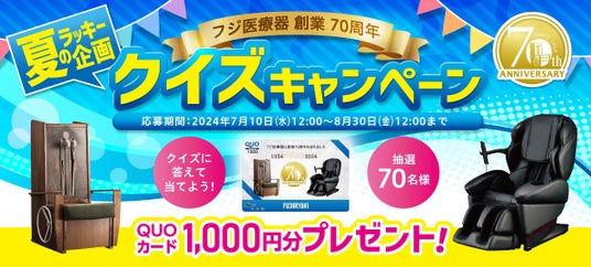 2024年4月に創業70周年を迎えた美と健康の総合メーカー、株式会社フジ医療器(本社:大阪市中央区)は、多くの方に当社商品について楽しみながら知っていただくため、クイズに正解した方の中から抽選で70名様にオリジナルデザインのQUOカード1,000円分が当たるキャンペーンを実施いたします。