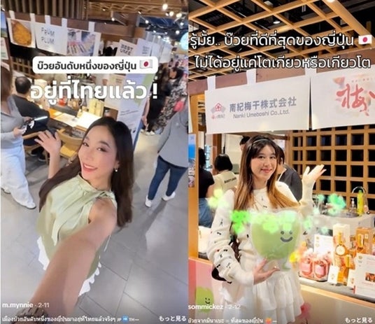 本イベントの広報宣伝にあたり、タイでも利用率の高いTikTokを活用し、インフルエンサーらによる告知プロモーションを実施しました。特に、日本旅行や海外トレンド、食品などに関心の高いフォロワーを有するインフルエンサーを10名厳選し、イベント会場での動画紹介や試食実況、プレゼント企画の告知などを通じて、効果的な集客を実現しました。また、単なる販売にとどまらず、会場では南高梅の歴史や生産者の想い、製造過程でのこだわりなどを動画やパンフレットでも紹介し、インフルエンサーを通じてタイの若い消費者層へアピールすることにも注力いたしました。