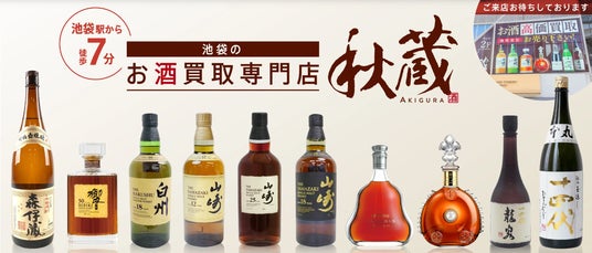 秋蔵は、ジャパニーズウイスキーをはじめ、焼酎やブランデーなど幅広く買取しています。現在日本酒買取キャンペーンを開催しているので、日本酒とまとめて竹鶴を売りたい方にもおすすめです。