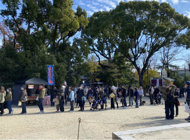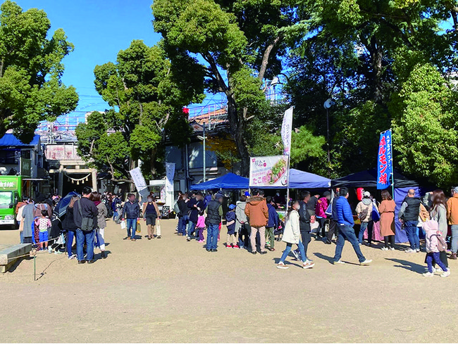 12月6日に豊中市の岡町商店街で、「テイクアウト・デリバリーフェア」が開催されました。商店街に隣接する神社境内と商店街内にキッチンカー6台と専用ブース15店が出店し、タコスやタコライス、たこ焼き、うどん、抹茶スイーツからペルー料理まで、多国籍のさまざまな飲食店が並びました。当日は、11時に開店し15時には全ての店舗で商品が売り切れました。