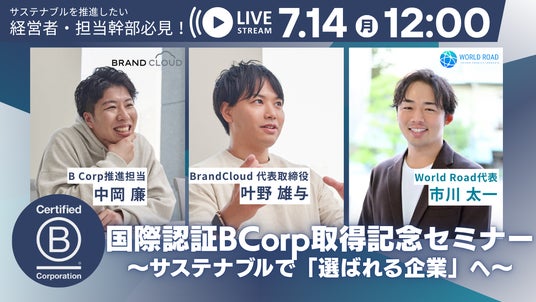 今回の認証取得を記念し、2025年7月14日(月)、ブランドクラウドがどのようにしてB Corp認証を取得するにいたったかやそのプロセス、国内外におけるサステナビリティ戦略ついて語るセミナーを開催いたします。