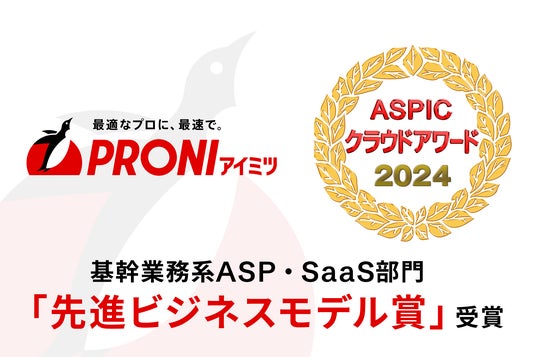 「中小企業の挑戦を支援し、日本経済の再成長に貢献する」PRONI株式会社(東京都品川区、代表取締役CEO 柴田大介、代表取締役Founder栗山規夫)は、一般社団法人日本クラウド産業協会(通称:ASPIC、東京都品川区、会長:河合 輝欣)が2024年11月20日(水)に発表した「第18回 ASPICクラウドアワード2024」において、BtoB受発注プラットフォーム「PRONIアイミツ」( https://imitsu.jp/ )が基幹業務系ASP・SaaS部門の「先進ビジネスモデル賞」を受賞したことをお知らせします。