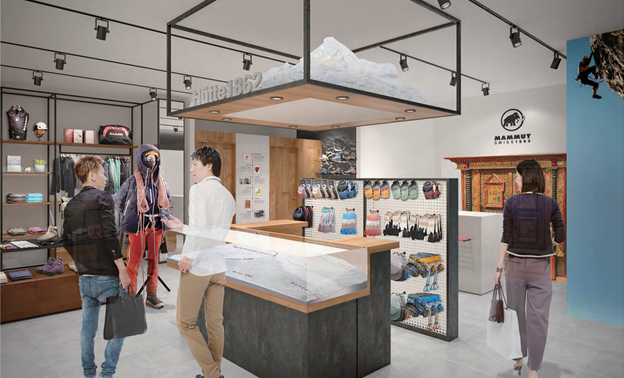 新しいブランド体験スペース“ヒュッテ1862”とは、マムートブランドのエッセンスに関する様々な「体験」を提供する特別な店内カウンターの総称です。マムート大阪で初めてのローンチとなります。このカウンターでは、様々な体験をお届けするために、スタッフが店舗ツールとデジタルを活用し、お客様に山の魅力と共にマムートの世界観を体験していただきます。