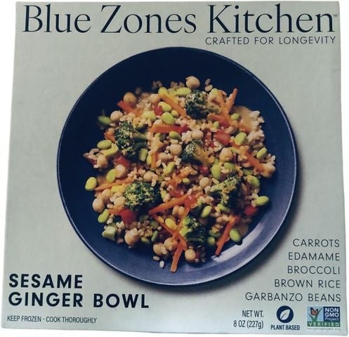 【健康寿命延伸の訴求×手軽さの例】アメリカで発売された、Blue Zones Kitchen Sesame Ginger Bowlはブルーゾーン・ダイエット(長寿が多い地域の生活様式を取り入れる活動 )の原則をベースに、沖縄のフレーバーや原材料を取り入れている。レンジ調理が可能で、外出先でも手軽に食べることができるのが特長。