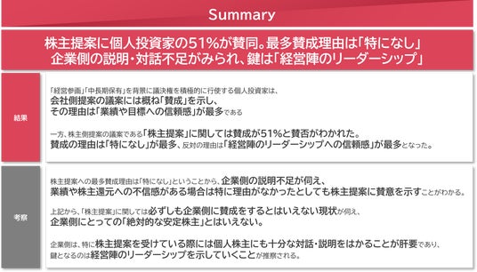 企業側は、特に株主提案を受けている際には個人株主にも十分な対話・説明をはかることが肝要であり、鍵となるのは経営陣のリーダーシップを示していくことが推察される。