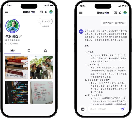 ※左:BaseMeプロフィール画面、右:BaseMe AI画面