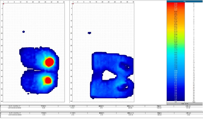 車の運転中にかかる脊髄への負担を計測したところ、SoftairSeatDriveがクッションとなり体圧分散し最大80%負担を軽減することがわかりました。接地面の圧力を国内測定機関で測定してみたところピーク圧力の値が80%減少しており、これにより圧力が分散されている事が分かります。普通に座った場合のピーク圧力(110.31kpa)に対し、immersepadBIKEの上に座るとピーク圧力(21.6kPa)が80%減圧しています。