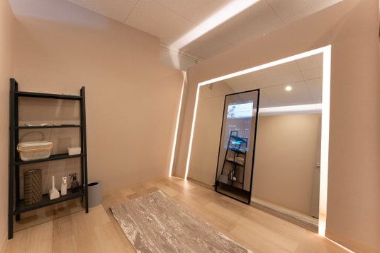 完全個室のプライベート空間には、ミラーフィット株式会社が独自開発したスマートミラー「MIRROR FIT.」を導入。ヨガ・ピラティス・トレーニングなどの多彩なプログラムを、臨場感のあるLIVEレッスンやオンデマンドコンテンツで楽しむことができます。