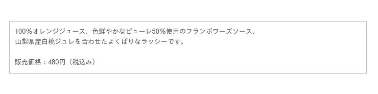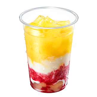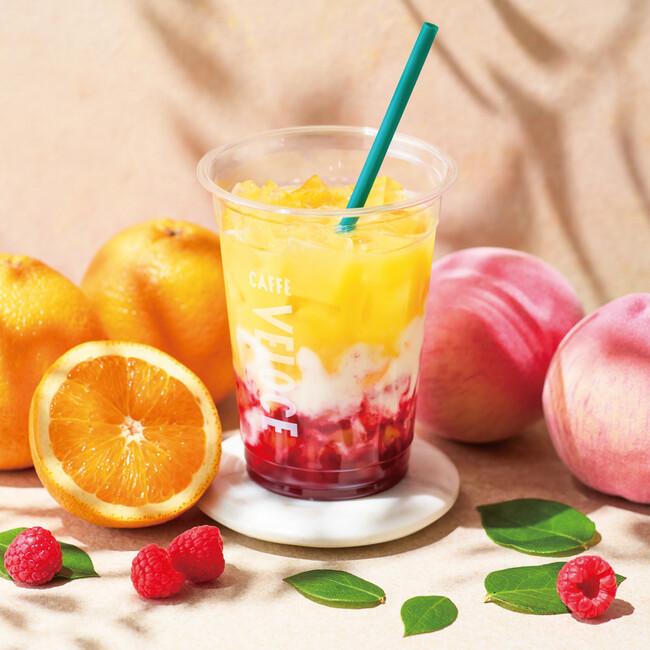 ドリンクのサイズは、気温が高まるこれからの季節にうれしい、Lサイズをご用意。1つのドリンクで、オレンジ、フランボワーズ、白桃の3つのおいしさをお楽しみください。