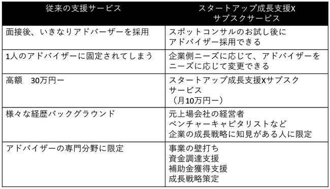 これまでのスタートアップ支援は支援する1人で支援するのに対して、スタートアップ成長支援Xサブスクサービスは、複数の専門家チームによる一貫した成長支援システムでスタートアップの成長を確実に支援します。