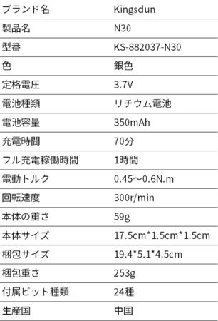 「Kingsdun(キングズダン) N30」とは「KS-882037」の次世代バージョンで、トルクと回転速度を大幅に増やしお客様の修理・メンテナンスの体験を改善しました。また、「製品の寿命を長く伸ばしたい」というお客様に要望に応じ、様々な機能を付けることで内蔵バッテリーを長持ちさせることも実現しました。