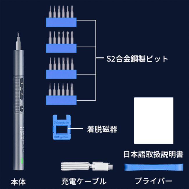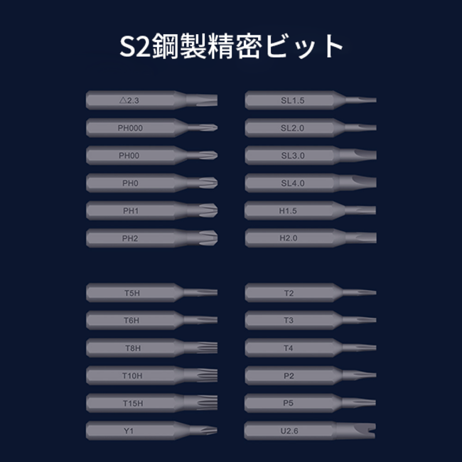 「N30」の付属品として、家庭用のほとんどのニーズに対応できるS2合金鋼製の24種類のビットを用意しました。ビットは硬度が60HRCで、丈夫で長持ちします。