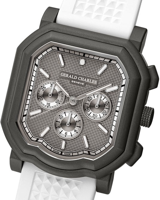 『Gerald Charles (ジェラルド・チャールズ)』のデザインは、バロック建築の奥深い創造美から着想を得ており、主にローマのバロック建築を代表する教会「サン・カルロ・アッレ・クワトロ・フォンターネ聖堂」からインスピレーションを受ています。教会内壁の六角形、八角形、および十字形の絶妙な組み合わせをケースへと見事に反映されており、他のどの時計にも見られない独創的なデザインとして完成されています。6時位置の丸みを帯びたケースデザインは、ジェンタ氏のスマイルラインとなっており、ジェンタ氏自身がポートレートを遺したとされています。クリエイティビティと熟練技術が絶妙なバランスで融合し、エレガントかつスポーツティーな仕上がりとなっています。