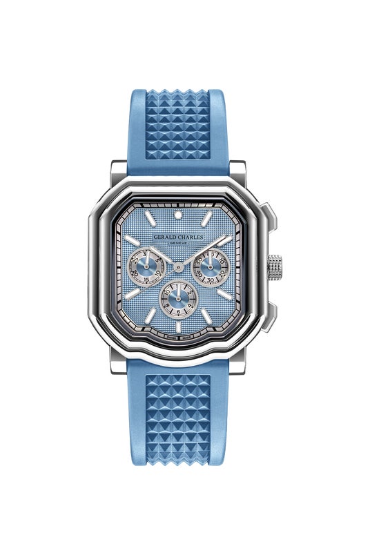 チタン製ケースのアンスラサイト仕上げは、ダークブラスト(Darkblast(R))加工という独自のパウダーを用いたサンドブラスト技術によって実現されたもので、ソフトでベルベットのような色合いを醸し出しながら、耐傷性を高め、大胆な存在感を維持します。さらに、ステンレススティールバージョンに施されたアイスブルーのアクセントは、ジェンタ氏の色彩への愛情へのオマージュであり、デザインに遊び心と洗練されたひねりを加えています。