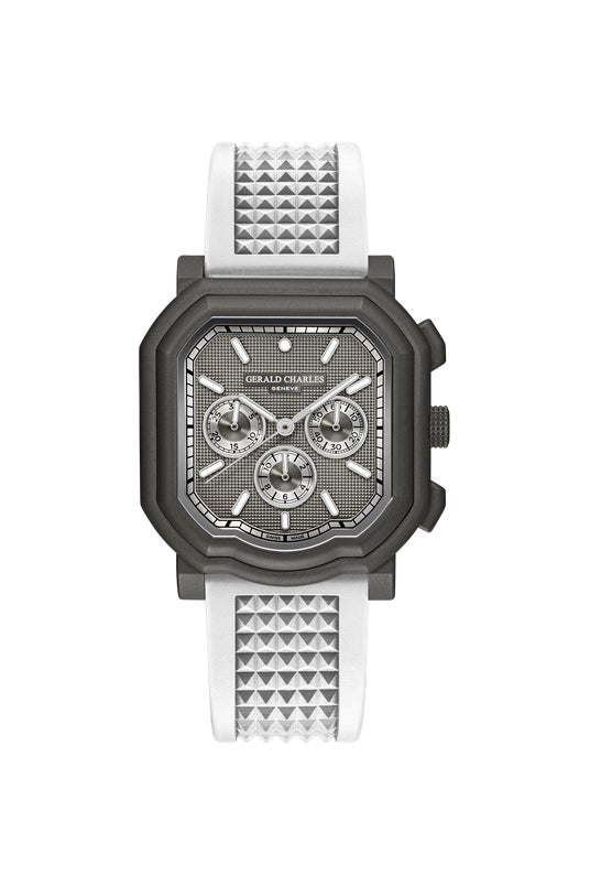 最初のマエストロ3.0 クロノグラフ グレーは、ダークブラスト(Darkblast(R))加工を施したグレード5チタンケースに、洗練されたグレーの文字盤とホワイトのバルカナイズドラバーストラップを組み合わせ、ブランドのシグネチャーであるミニ・タピスリーパターンがアクセントを添えています。