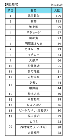 ●男性1位は武田鉄矢さん、2位は僅差で林修さん