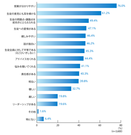 今回、全国の中学・高校生の親(男女)3,600人を対象に、学校の先生に必要だと思うことを調べたところ、「授業が分かりやすい」(76.0%)、「生徒の意見にも耳を傾ける」(61.2%)、「生徒の問題点・課題点を前向きにとらえられる」(49.4%)、「生徒への愛情がある」(47.1%)といった生徒(子ども)への)関わり方が上位を占めました。続いて、「親しみやすい」(46.4%)、「話が面白い」(46.2%)、「生徒全員に対して平等である(えこひいきしない)」(45.3%)など、学習指導以外にも生徒(子ども)への)関わり方が重要視されていました。