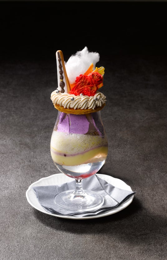 ダンブルドア校長をテーマにしたプレミアムパフェが登場。ニワトコの杖のクッキーや、レモン風味の綿あめで表現した特徴的な髭、不死鳥のフォークスに見立てたクリームとチョコレートオーナメント。さらに、ダンブルドアの好物であるレモンキャンディーをイメージしたフレーバーと相性の良いチャイのクリームを使用したパフェは、食べ進める度に新しい味を楽しむことができます。