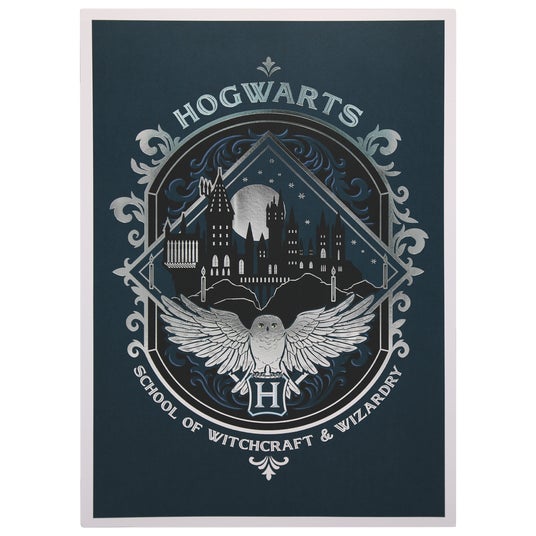 キラキラ光るメタリック シルバーホイルで彩られたA3 サイズのポスター。ホグワーツ城のシルエットを背景に翼を広げるヘドウィグが描かれた、ファン必携のコレクタブルアイテムです。
