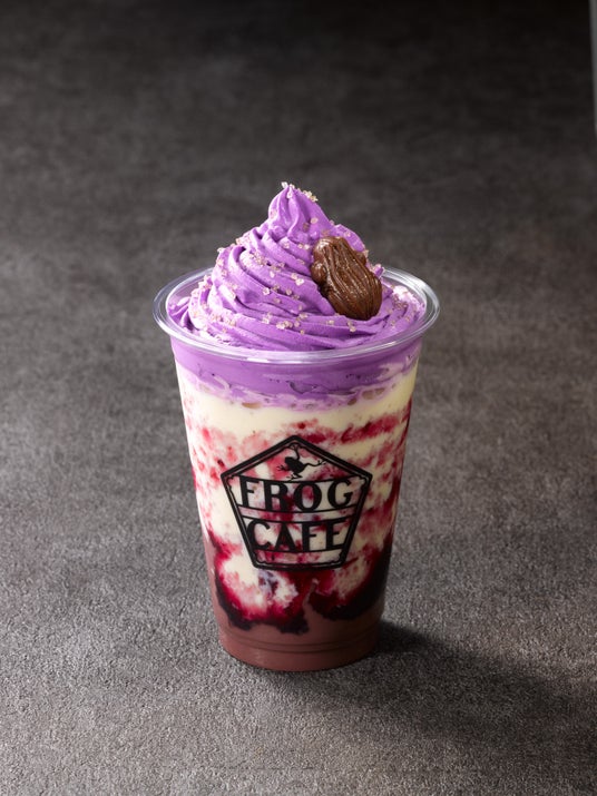 フロッグカフェのテーマカラーである紫とゴールドをイメージした新作のミルクシェイク。ベースはアサイーヨーグルトとブルーベリーソースで、すっきりとした甘さをお楽しみいただけます。