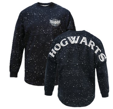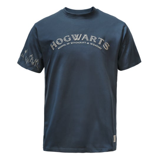 人気のTシャツが本コレクションにも登場。着心地のいい100%コットン素材で、前胸に「ホグワーツ」の刺繍ワッペン、右袖にホグワーツ城のシルエットが描かれています。