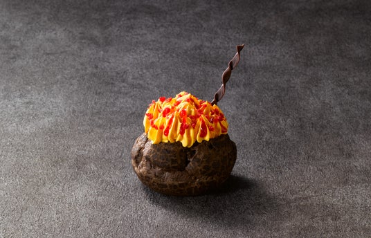 魔法薬学の授業などに登場する大鍋をイメージし、黒く焼き上げたパイ生地の中にはカスタードクリームがたっぷり。大鍋から立ち上がる煙をマンゴー風味のホイップクリームとラズベリー、マンゴーソースで表現しました。