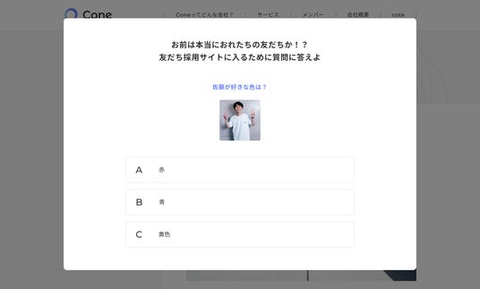 当社採用ページ(https://coneinc.jp/friend-recruit/)にアクセスすると、メンバーそれぞれに関する3択クイズがポップアップ表示されます。正解しなければ採用ページにアクセスできない仕様とし、「本当にメンバーを知っている人」のみが先に進める設計としました。