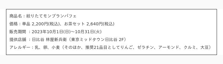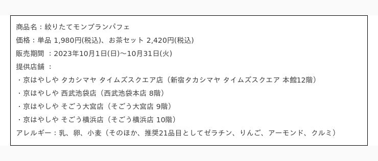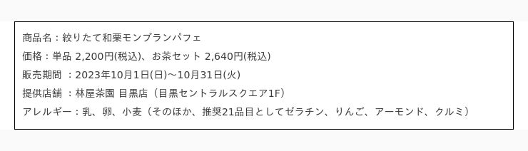 『京はやしや』各店(新宿、池袋、大宮、横浜)及び『日比谷 林屋新兵衛』、『林屋茶園』では、10月1日(日)から10月31日(火)まで「絞りたてモンブランパフェ」を販売致します。和栗のクリーム、くるみ、りんごなど、秋が旬の食材をすっきりとしたほうじ茶アイスと頂く、お茶屋らしい趣ある一品です。